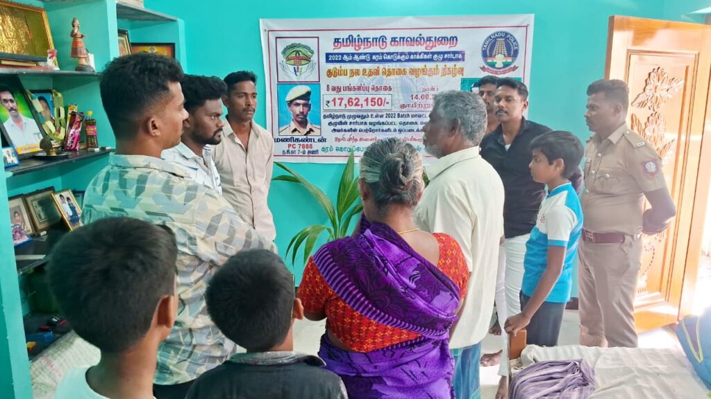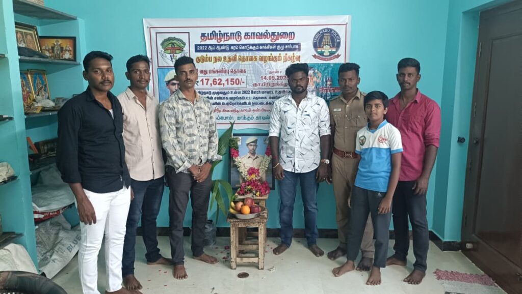 In a touching display of love and solidarity, a financial contribution collected through the “Karam Kodukkum Kaakkigal” (Helping Hands of Police) group was handed over to the family of late 2022 batch police constable Manikandan from Salem district.
