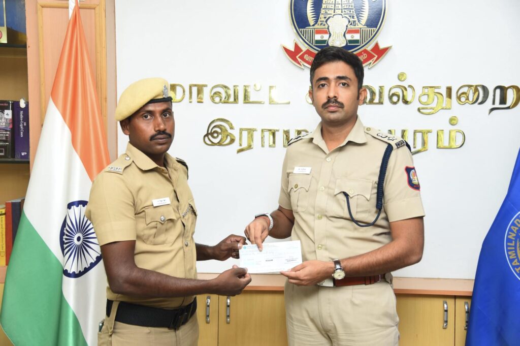The cheques were personally handed over by Mr. G. Sandheesh, IPS, Superintendent of Police, Ramanathapuram District, to Mr. Sethuraja, a family member of the late Muniyasamy.