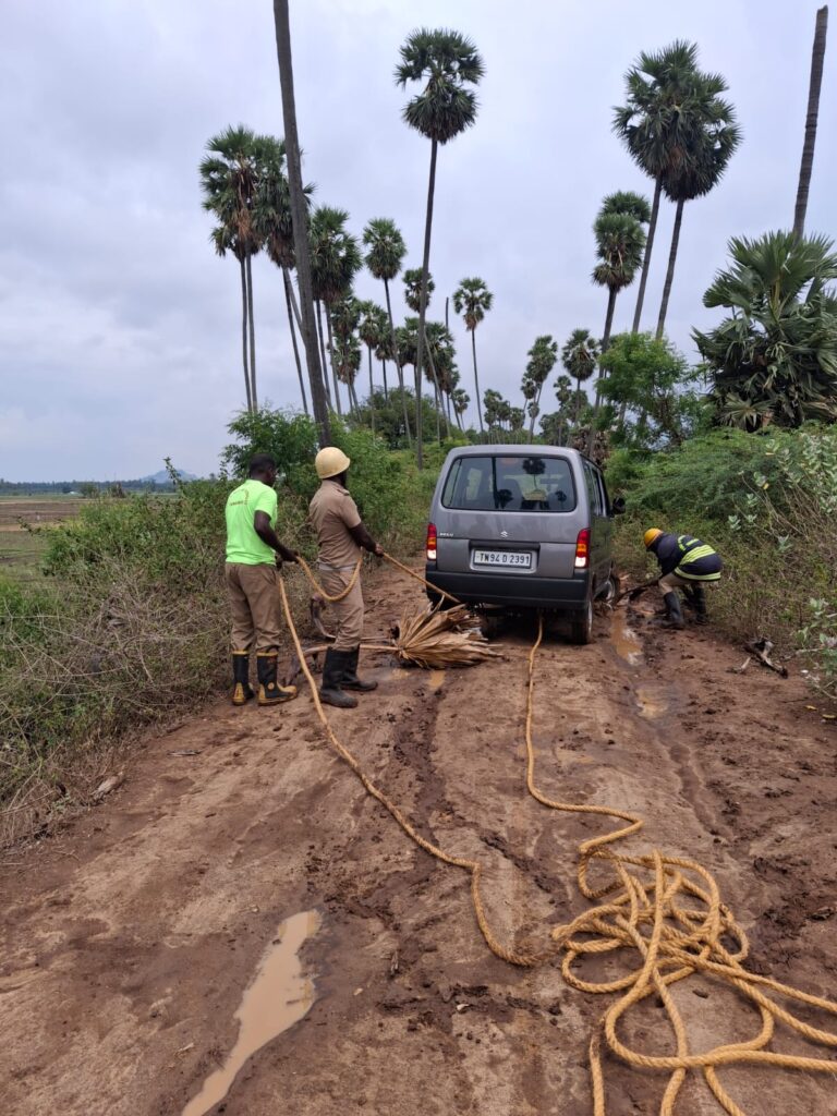Unable to free the vehicle on their own, the family immediately contacted the Palani Fire and Rescue Department for help. Responding swiftly, a team of firefighters rushed to the spot. However, due to the severe muddy conditions, even the fire rescue vehicle could not reach the exact location.